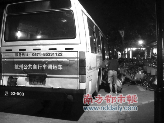 杭州“调度大巴”彻夜运输自行车,保证热点地区一定“有车可借”、“有位可还”。南都记者陈佳摄